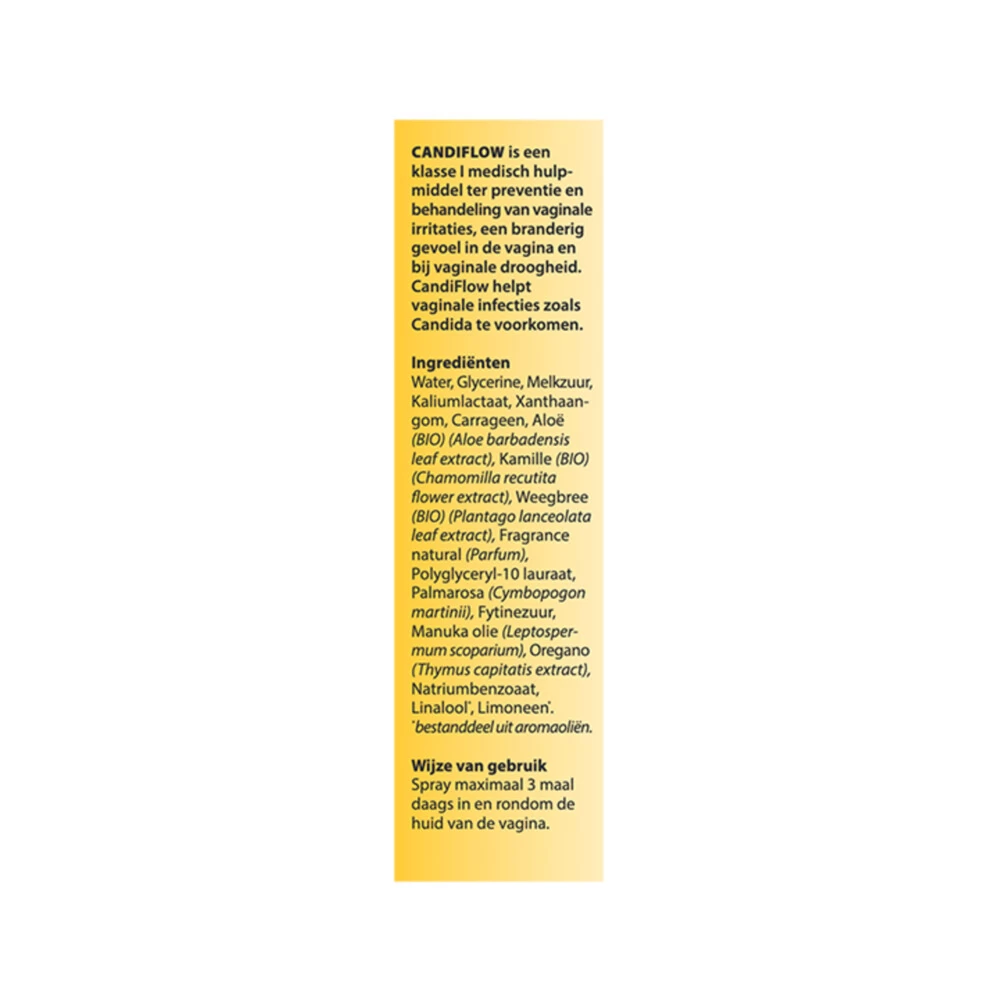 Bloem CandiflowMedisch hulpmiddel. Bloem Candiflow 422 gebruik je ter preventie en behandeling van vaginale irritaties, een branderig gevoel en vaginale droogheid door bevochtiging van het vaginaal epitheel. CandiFlow bevat melkzuur om de zuurgraad in de vagina in het veilige gebied te brengen van 4 – 4,5 pH.
