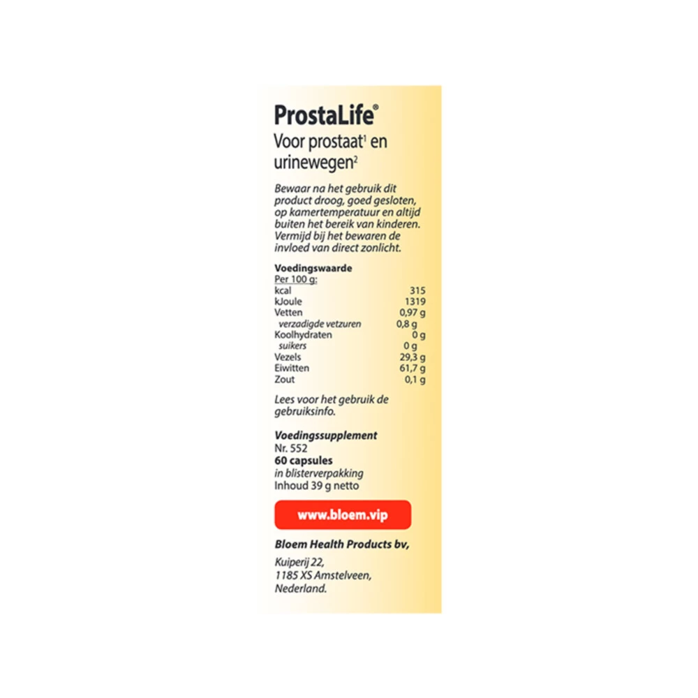 Ondersteunt de prostaatfunctieBloem Prostalife nr. 552 voor prostaat en urinewegen bevat brandnetel en zaagpalm. Deze planten hebben een gunstige invloed op de prostaat en urinewegen. Prostalife is een Kruiden-, vitaminen- en mineralenpreparaat, aangevuld met Bèta-sitosterol en lycopeen.Voor het behoud van een normale prostaat (1)*Goed voor de prostaatfunctie(1)*Goed voor de urinewegen van de man vanaf 45 jaar(2)*(1)Brandnetel en zaagpalm (2)Zaagpalm* = Gezondheidsclaim in afwachting van