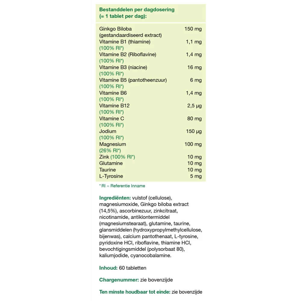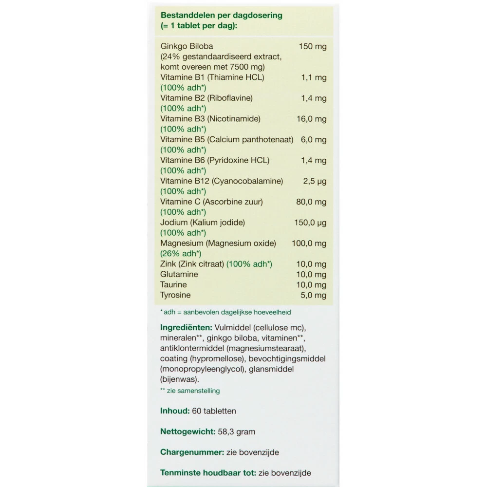 Ginko CombiGinkgo Combi is een uitgebreide formule. Is goed voor het geheugen en de concentratie*, voor het behoud van een heldere geest** en bevat een krachtige dosering van het Ginkgo Biloba Extract (7500mg). Dit product is geschikt voor vegetariërs.Ondersteund het geheugen en de concentratieVoor goede prestaties, ook bij geestelijke druk en inspanningGlutenvrij en lactosevrijGeschikt voor vegetariërs*Ginkgo biloba, vitamine B1, B6, B12, C, jodium en zink**Vitamine B1, B6, B12, C, jo