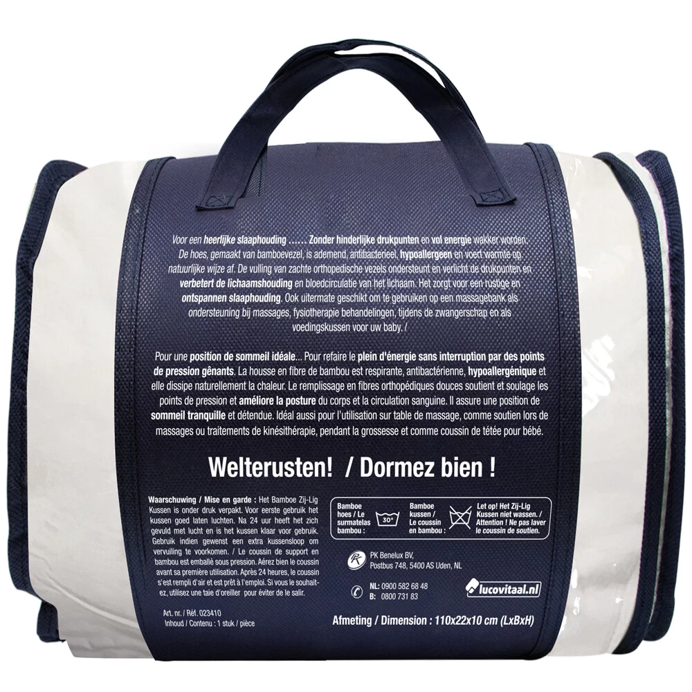 Orthopedisch zijligkussenHet Bamboe zijlig ondersteuningskussen van Lucovitaal helpt bij een heerlijke slaaphouding zonder hinderlijke drukpunten waardoor je vol energie wakker wordt.De eigenschappen van het ondersteuningskussen100% bamboehoes waardoor ademend, hypoallergeen en antibacterieelBiedt ondersteuning voor de benen, knieën, bekken, heupen, buik, rug, armen en nek voor de juiste slaaphoudingIdeaal tijdens en na de zwangerschap en geschikt als voedingskussen