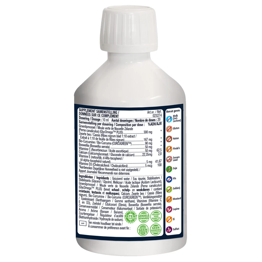 Lucovitaal Groenlipmossel VloeibaarGroenlipmossel Vloeibaar van Lucovitaal bevat onder andere pure en zuivere Nieuw Zeelandse Groenlipmossel, Boswellia en Zwarte bes.Zwarte bes heeft een verzorgende invloed op spieren en gewrichtenCurcumine heeft een beschermende invloed op weefsels en cellen en bevordert het afweersysteem Vitamine C ondersteunt het immuunsysteem De toegevoegde Curcumine bevordert het natuurlijk afweersysteem en heeft een beschermende invloed op gezonde weefsels en cellen. Vit