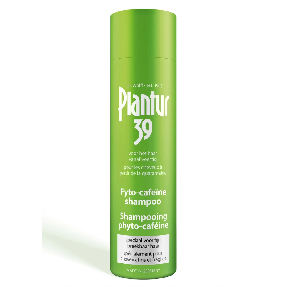 Plantur 39 Caffeine Shampoo 250 mlPlantur 39 Caffeine Shampoo helpt haaruitval voorkomen en verstevigt het haar vanaf 40. De activerende cafeïne in Plantur39 dringt bij het wassen door tot in de haarfollikels, hierdoor wordt (vroegtijdig) haaruitval als gevolg van de menopauze verminderd. De shampoo zorgt ervoor dat jouw kapsel haar volume behoudt en is geschikt voor fijn en breekbaar haar. Voor een optimale werking de shampoo gedurende 2 minuten laten intrekken, daarna uitspoelen.Helpt haa