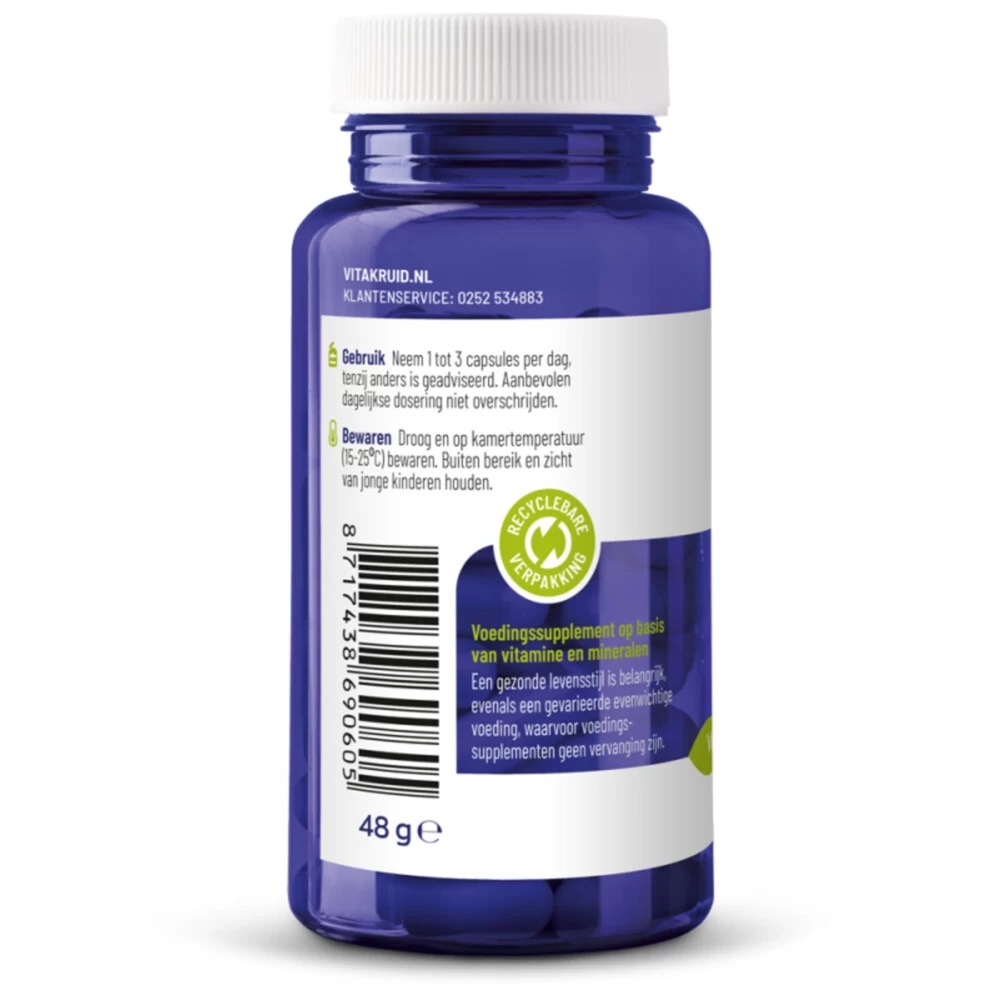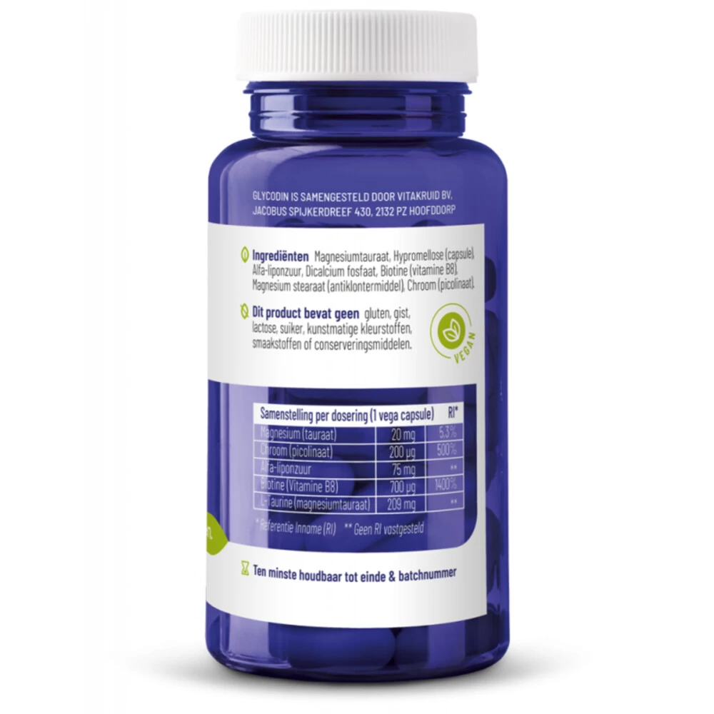 Vitakruid Glycodin Vitakruid Glycodin is een complexformule die bestaat uit alfa-liponzuur, chroom picolinaat, biotine en magnesiumtauraat, een uitgebalanceerd kwartet voor de bloedsuikerspiegel. Complexformule Glycodin is speciaal ontwikkeld om de natuurlijke bloedsuiker te ondersteunen*. Uitgebalanceerd kwartet voor de bloedsuikerspiegelBiologisch beschikbaar magnesiumtauraatVersterkte werking door biotineLichaamseigen alfa-liponzuurVegacapsulesGlutenvrij en lactosevrijVegan*Chroom z