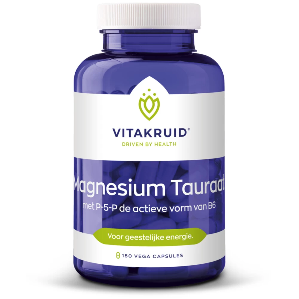 Vitakruid Magnesium Tauraat B6Vitakruid Magnesium Tauraat met P-5-P Capsules is een voedingssupplement met magnesium, L-taurine en vitamine B6. De toegevoegde Magnesiumtauraat is een biologische beschikbare en organisch gebonden vorm van magnesium. Hierdoor wordt het beter door het lichaam opgenomen. Daarnaast zorgt vitamine B6 ervoor dat magnesium beter wordt opgenomen. Ook bevat het L-taurine dat het makkelijker maakt voor het magnesium om de bloed-hersenbarrière te passeren. Vervolgens